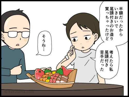この漫画の登場人物この漫画は実話や日常に気がついたことをネタにしたフィクションです。登場人物も架空のキャラです。 コマコ中年主婦 コマコのダンナ 最近は尾頭付きの刺し身はあえて買わなくなっています。理由はやはり捨てる時に面倒だから。頭だけで... -